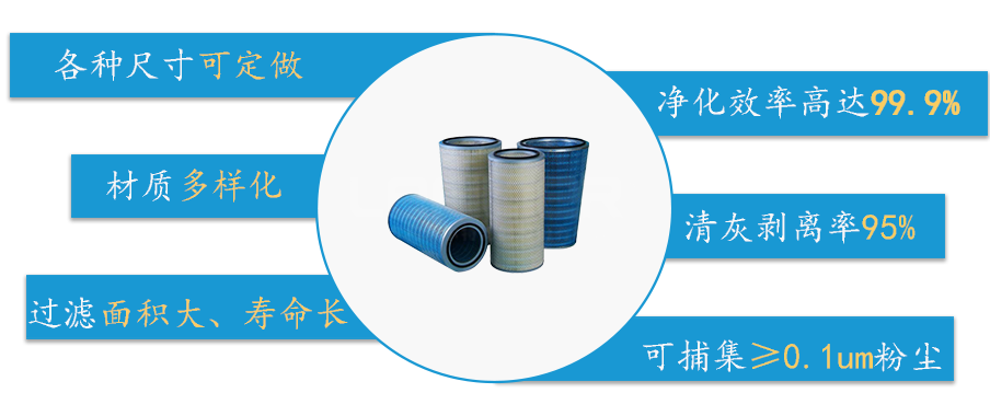 新鄉市利菲爾特濾器股份有限公司專業生產文氏里管法蘭式濾筒,空氣除塵濾筒由長度挺括的濾料折疊成褶, 尾粘合而成的星形過濾筒。濾筒無籠骨,安裝簡便。空氣除塵濾筒的品種較多,有細而長與粗而短之分。細長濾筒(如Φ≤160,L=1~2m),其褶(如45褶)間空隙大、夾角大,褶少而淺,過濾面積比同徑同長的濾袋大2~5倍,清灰易而效果好;適用于濃度≥15g/m粉塵的過濾除塵,過濾風速0.6~1.2m/min。粗短濾筒(如Φ350,L=0.66m)直徑大、長度短、褶多(120~350褶)而深、褶間空隙小,過濾面積大,較之同徑同長濾袋面積大14~35倍,適于場地面積小、空間小的地方布置;但因褶角小,粉塵易積聚,難于清灰,適于濃度≤5g/m粉塵的過濾除塵,過濾風速不宜>0.6m/min。空氣除塵濾筒是由 長度挺括的濾料折疊成褶, 尾粘合而成的星形過濾筒。濾筒無籠骨,安裝簡便。濾筒的品種較多,有細而長與粗而短之分;細長濾筒(如Φ≤160,L=1~2m),其褶(如45褶)間空隙大、夾角大,褶少而淺,過濾面積比同徑同長的濾袋大2~5倍,清灰易而效果好;適用于濃度≥15g/m粉塵的過濾除塵,過濾風速0.6~1.2m/min。粗短濾筒(如Φ350,L=0.66m)直徑大、長度短、褶多(120~350褶)而深、褶間空隙小,過濾面積大,較之同徑同長濾袋面積大14~35倍,適于場地面積小、空間小的地方布置;但因褶角小,粉塵易積聚,難于清灰,適于濃度≤5g/m粉塵的過濾除塵,過濾風速不宜>0.6m/min。