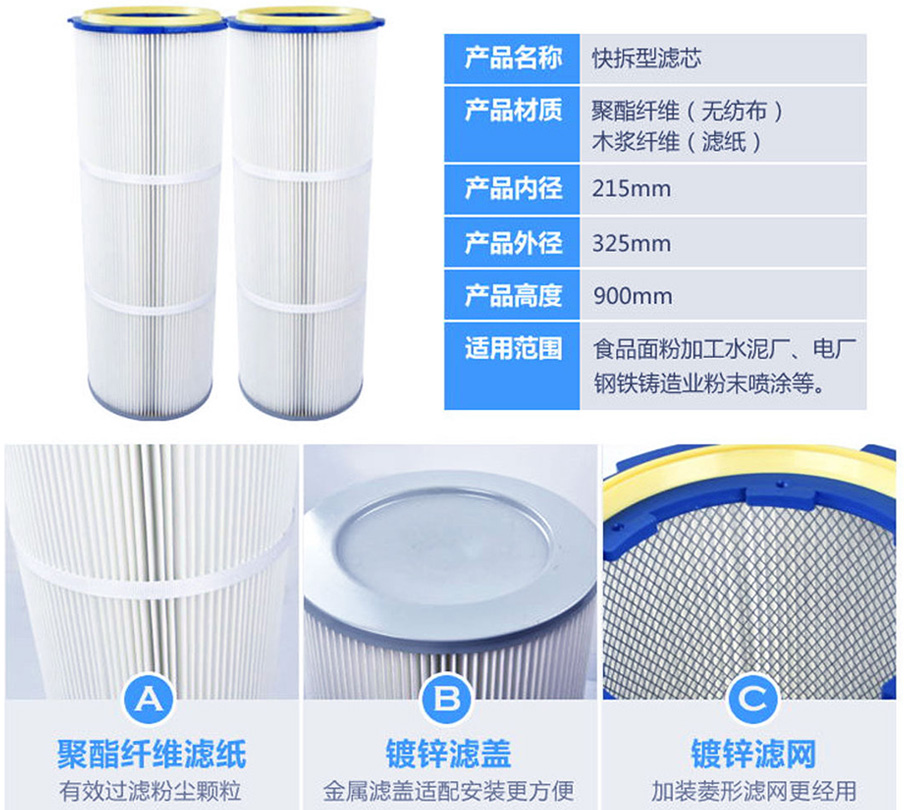 可用水洗。此濾筒適用既有纖維性粉塵又有非纖維性粉塵的應(yīng)用、易聚結(jié)性粉塵的應(yīng)用、以及在使用中需要對(duì)濾筒進(jìn)行水洗之應(yīng)用。例如:木材加工、谷物處理、復(fù)合材料的打磨、金屬拋光以及食品加工和制藥等應(yīng)用。